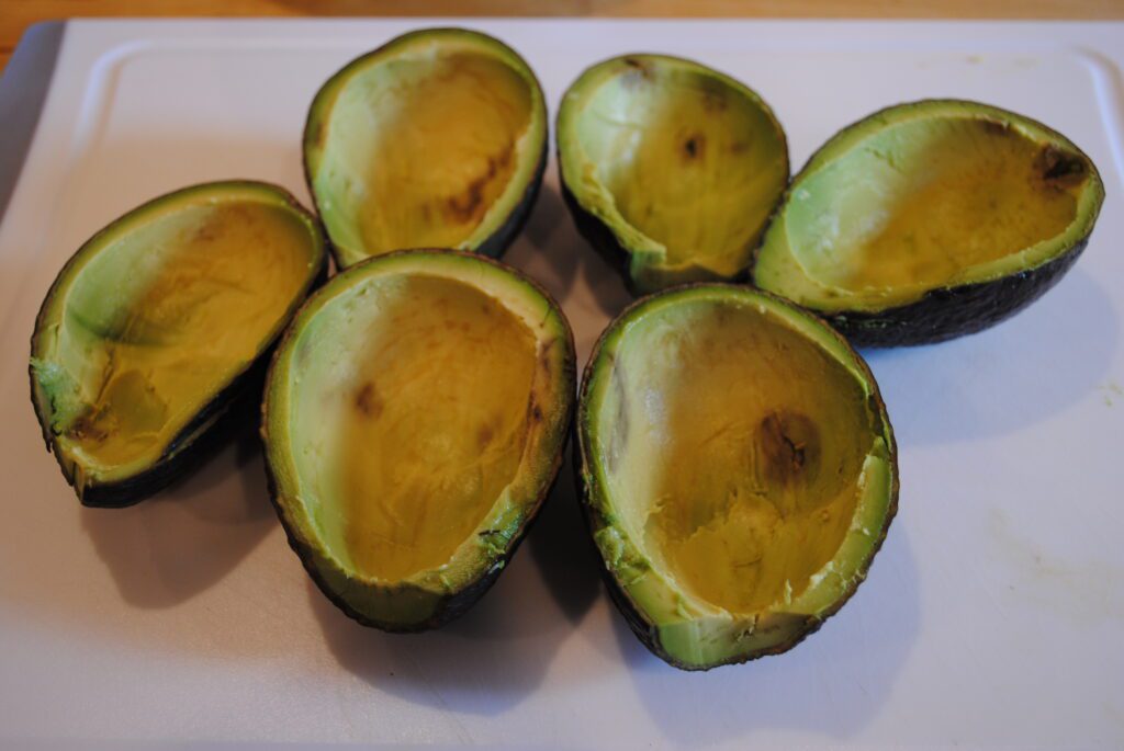 - Prep avocados. Cut the avocados in half and remove the seed. Cull the flesh out of the avocados, leaving about 1/4 inch in the shell. Rough chop the flesh, leaving it chunky.