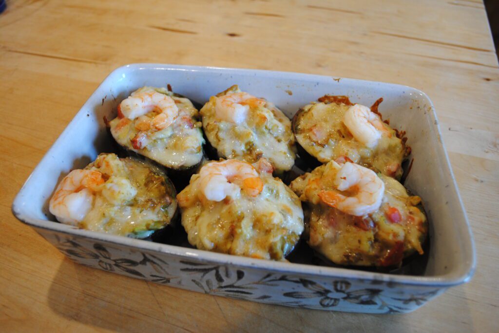 Scoop spoonfuls of the mixture into the shells, letting them heap up on top. Sprinkle the remaining cheese over the avocados. Bake at 350 degrees for 30 minutes. Remove from the oven and top each one with one of the shrimps you set aside earlier.