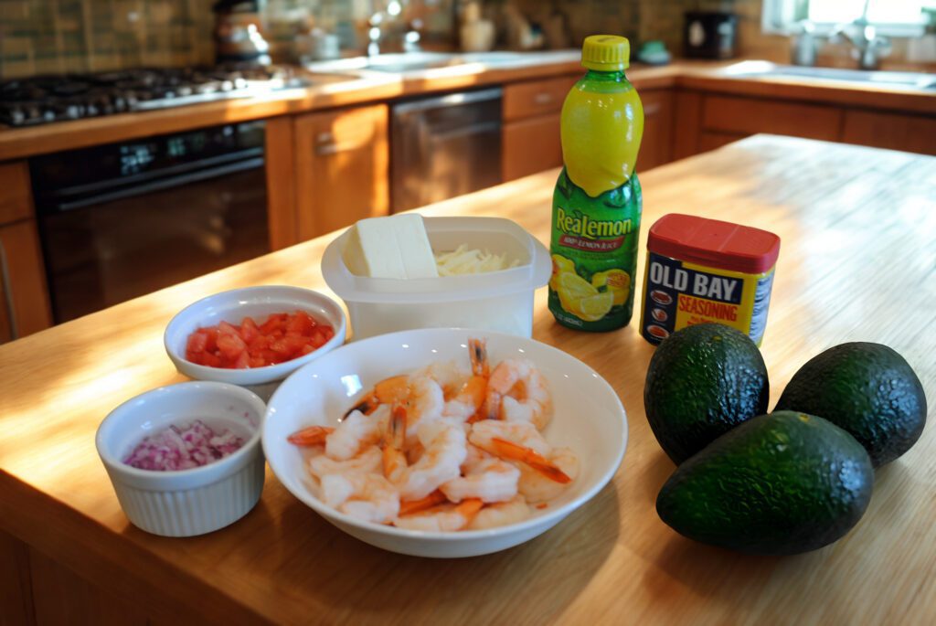 Indulge in rich, creamy shrimp-stuffed avocados—loaded with chopped shrimp, avocado, white cheddar, onions, and savory seasonings. A flavorful and satisfying dish perfect for lunch or entertaining.